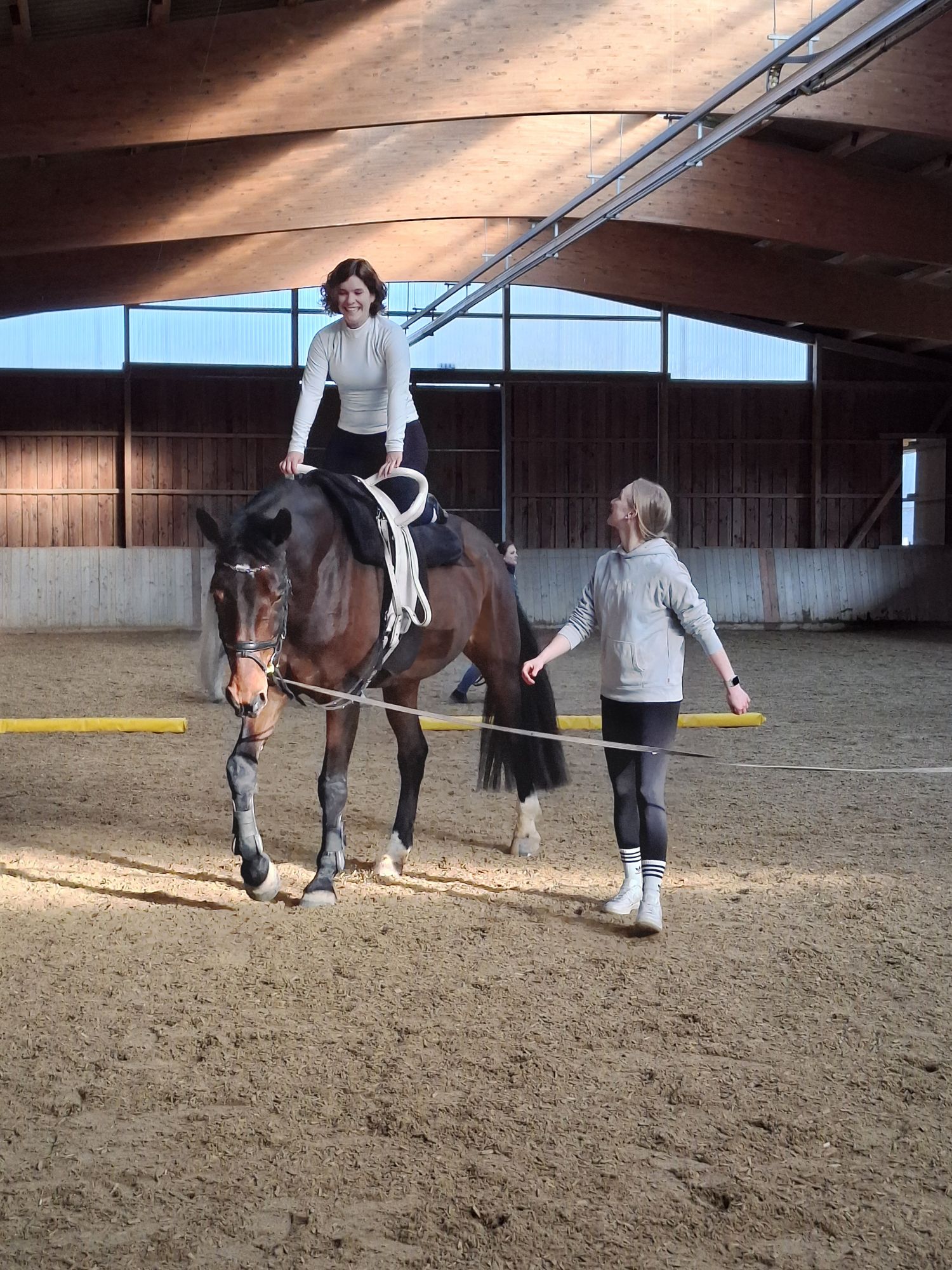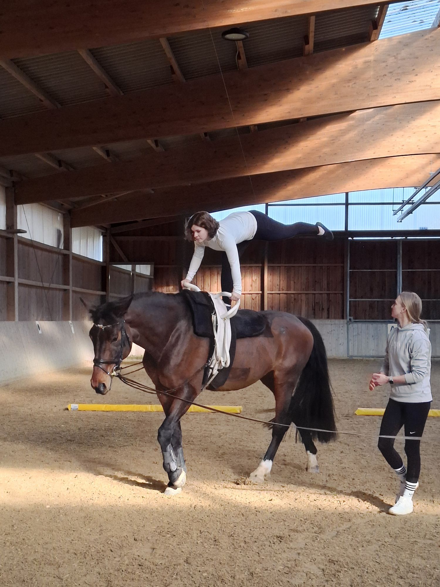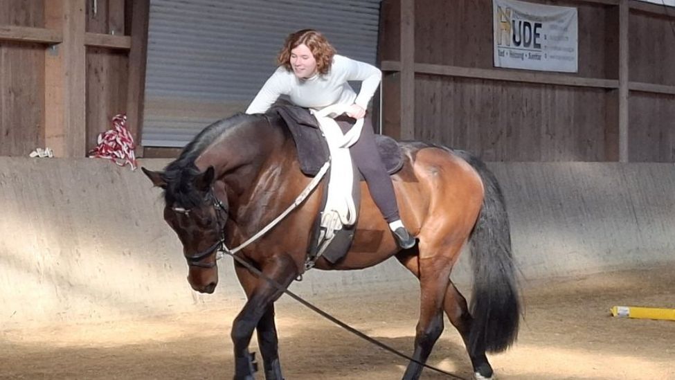 Maren Busch ließ es sich natürlich nicht nehmen, selbst aktiv zu werden – gemeinsam mit Cosima. So konnte sie sich einen ganz persönlichen Eindruck vom Zusammenspiel zwischen Mensch und Tier verschaffen und traute sich immer mehr Akrobatik auf dem Pferderücken, je länger sie und Cosima Vertrauen zueinander aufbauten.