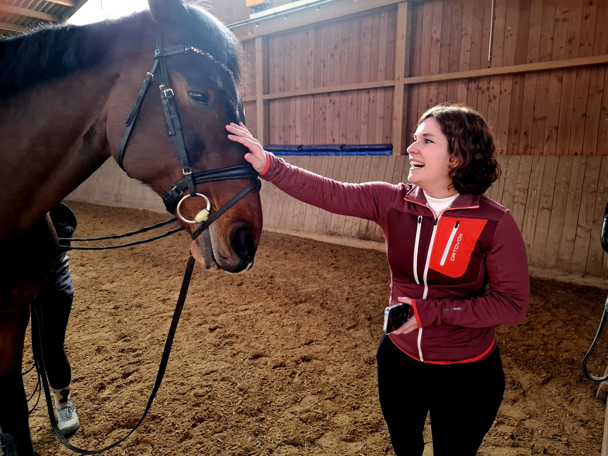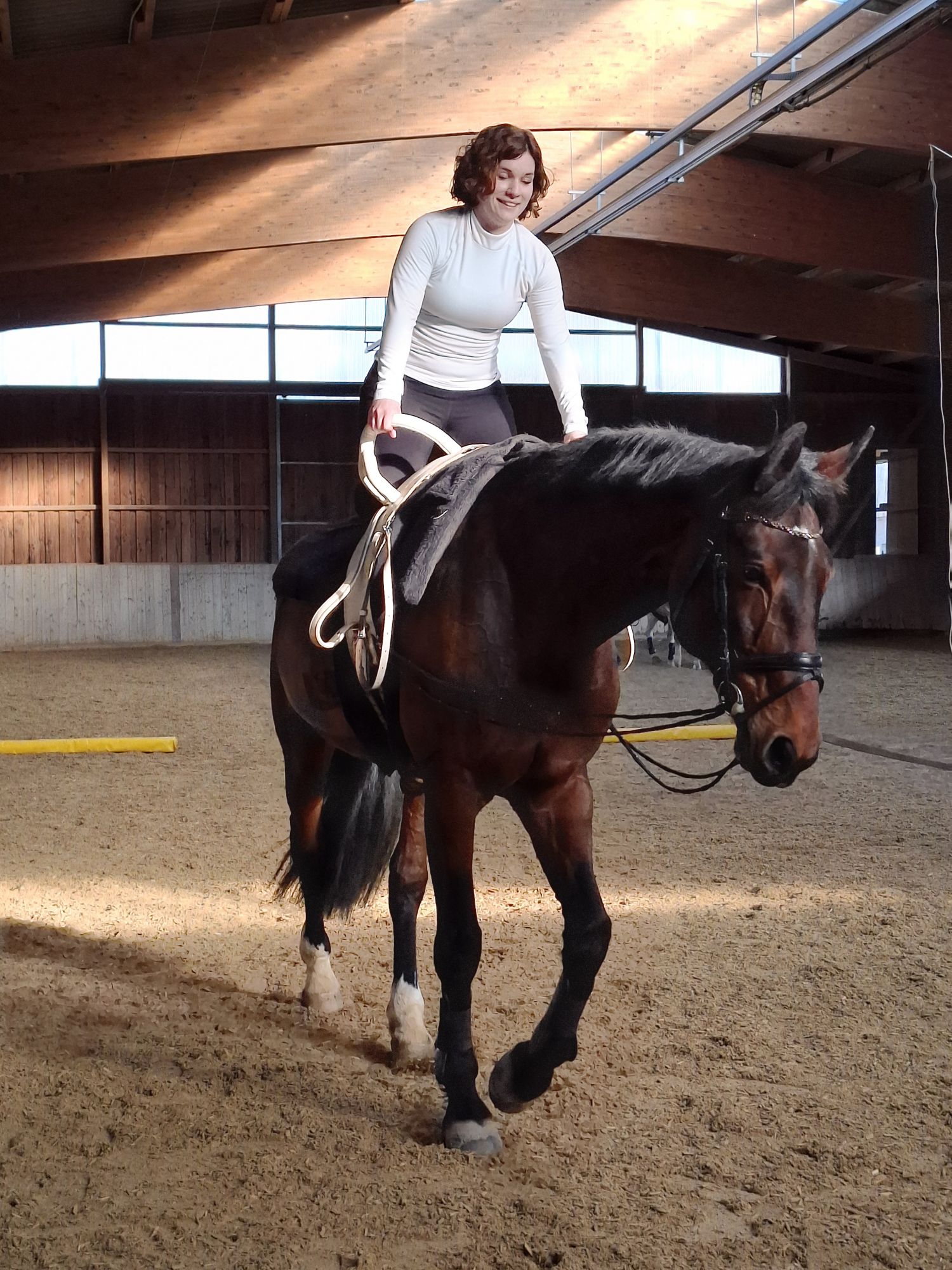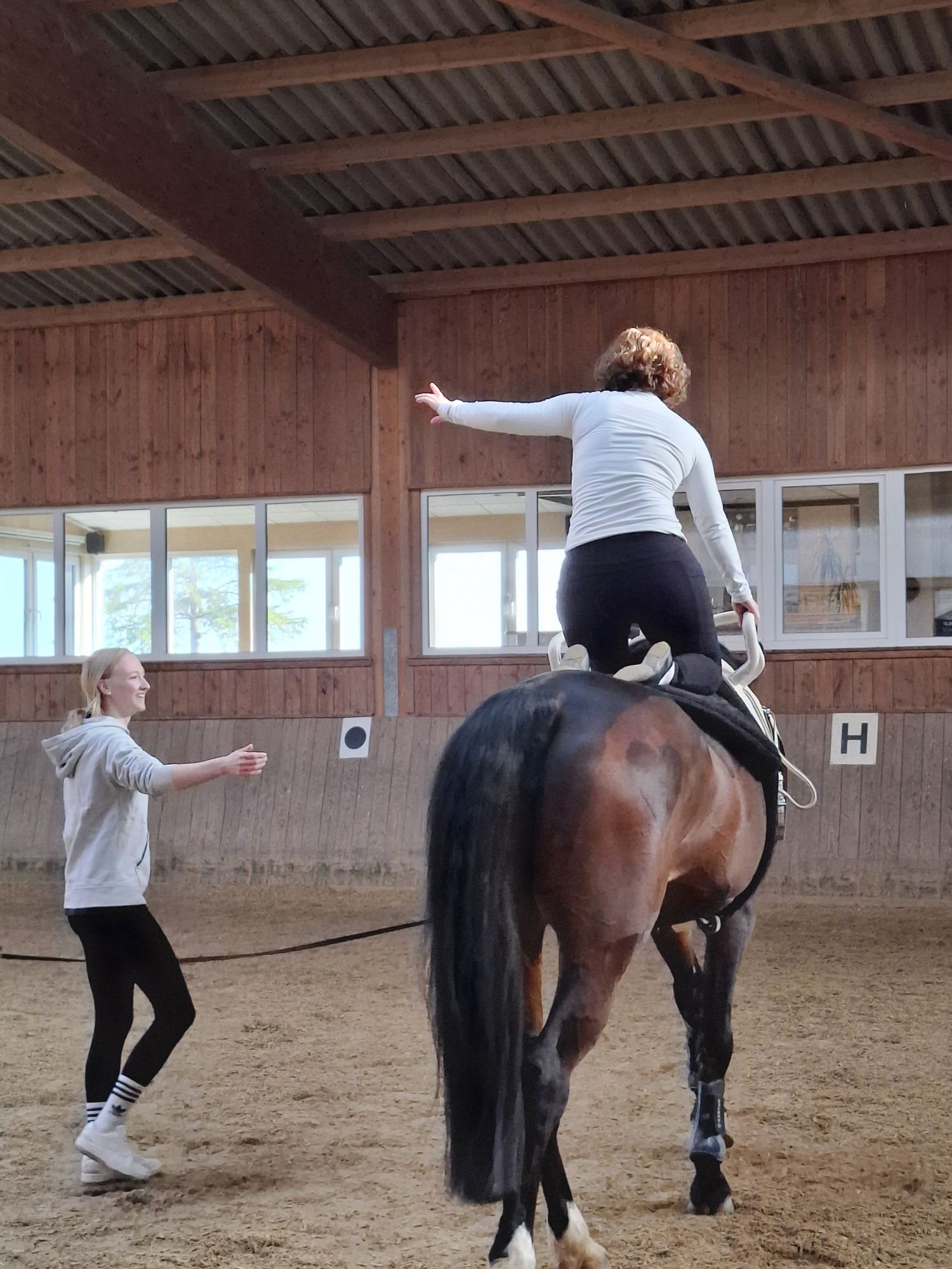Maren Busch ließ es sich natürlich nicht nehmen, selbst aktiv zu werden – gemeinsam mit Cosima. So konnte sie sich einen ganz persönlichen Eindruck vom Zusammenspiel zwischen Mensch und Tier verschaffen und traute sich immer mehr Akrobatik auf dem Pferderücken, je länger sie und Cosima Vertrauen zueinander aufbauten.