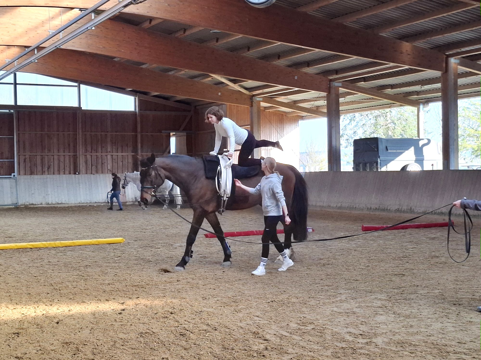Beim Besuch vor Ort wurde deutlich, mit wie viel Engagement die Trainerinnen und Trainer ihre Gruppen betreuen. Unter der Anleitung von Antonia Güll, Christina Meckel, Lara Fetter, Carolin Pirc sowie dem ersten Vorsitzenden Lars Hoffmann konnten die jungen Voltigiererinnen und Voltigierer ihr Können präsentieren. Unterstützt wurden sie dabei von den beiden Pferden Pedro und Cosima, die ruhig und zuverlässig ihre Runden drehten. Ein weiteres Pferd befindet sich derzeit in Ausbildung.