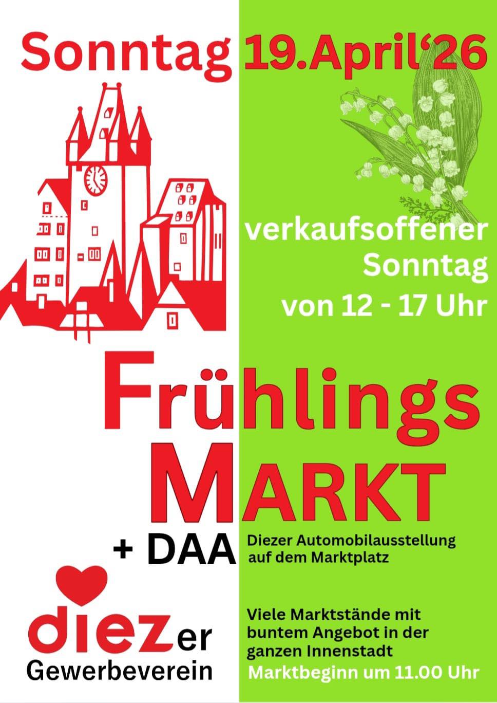 Am Sonntag, dem 19.04. wird der Marktbereich (Wilhelmstraße ab Querspange in Richtung Rosenstraße, Rosenstraße und die Parkplätze Marktplatz auf der Seite Rosenstraße und Schulstraße), die Diezer Altstadt (Fußgängerzonenbereich Marktstraße, Altstadtstraße, Alter Markt und Pfaffengasse) ab 06:00 Uhr gesperrt und voraussichtlich um 20:00 Uhr wieder geöffnet. Fahrzeuge, die im Marktbereich in Garagen abgestellt sind, können während dieser Zeit nicht mehr heraus- bzw. hereingefahren werden. Eventuell anfallende Transporte bzw. Anlieferungen für Geschäfte und Privatbedarf sind rechtzeitig durchzuführen.