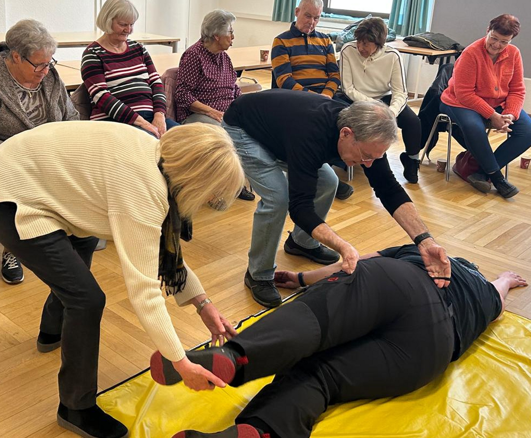 Im Theorieteil standen vor allem altersrelevante Notfälle wie Schlaganfall, Krampfanfall, Atemnot, Hitze- und Kältenotfälle sowie Herzinfarkt im Mittelpunkt. Anschließend ging es an die praktische Umsetzung: geübt wurden die stabile Seitenlage, verschiedene Umlagerungstechniken und die Herzdruckmassage.