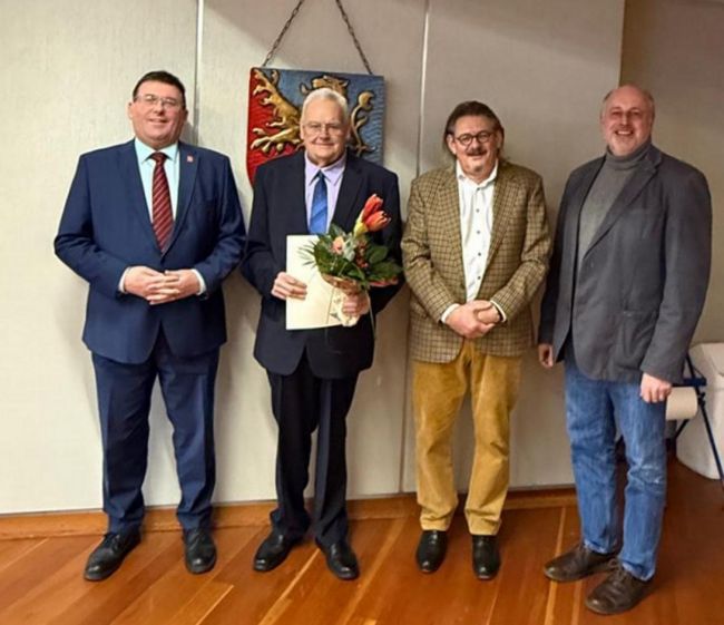 v.l.n.r.: Landrat Jörg Denninghoff, Günter Neu, Ortsbürgermeister Ralf Schmidt, Erster Beigeordneter Torsten Loosen